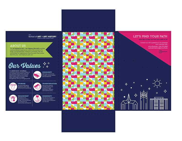 While I was apart of MINT studio at the University of Florida, my group worked with UF's School of Art + Art History (SA+AH) on a project to increase their yield of accepted students. Over the past few years, their yield has been below the UF overall yield. The SA+AH needs a solution that will attract students to the UF SA+AH and highlight how their school is special. Our solution to this problem was to create a variety of deliverables including a welcome package, a brochure that doubles as a poster, a pennant, stickers, a lanyard, buttons, and pencils with a paper gator holder. These items would be sent to accepted students or given to prospective students to encourage them to come to the SA+AH. We prepared print-ready files for the client to use for years to come.